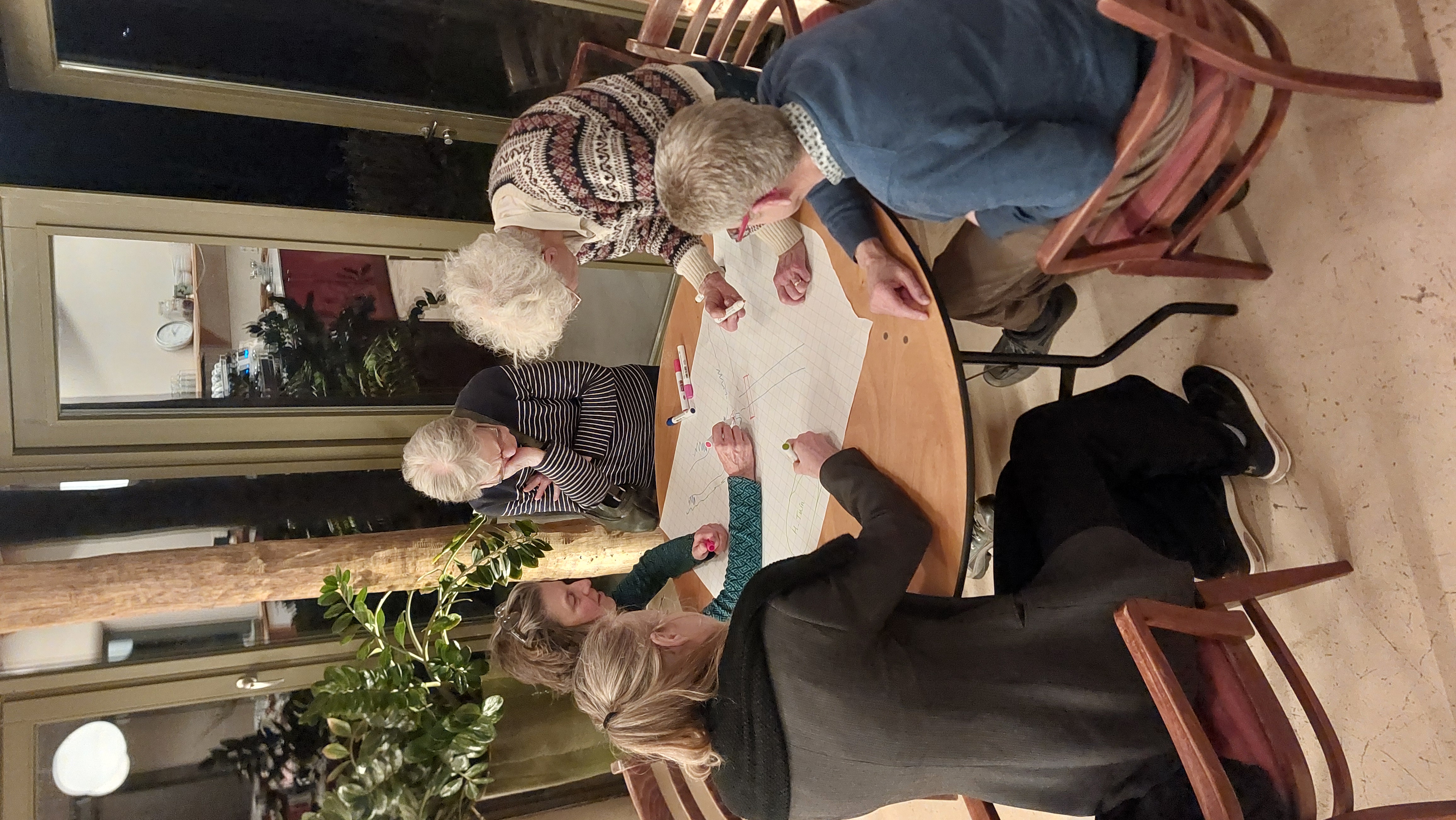 De resultaten werden uitgestald op de vloer. Van een voedselbos dat de seizoenen ademt, tot een brinkdorp waar ossenwagens het tempo bepalen. Of een hechte community waar samen wordt gekookt, gedeeld en geleefd. De toekomst groeide deze avond in de ruimte van onze verbeelding. Dank aan Ruben Jacobs voor het verruimen van onze blik en het aanreiken van frisse perspectieven!
