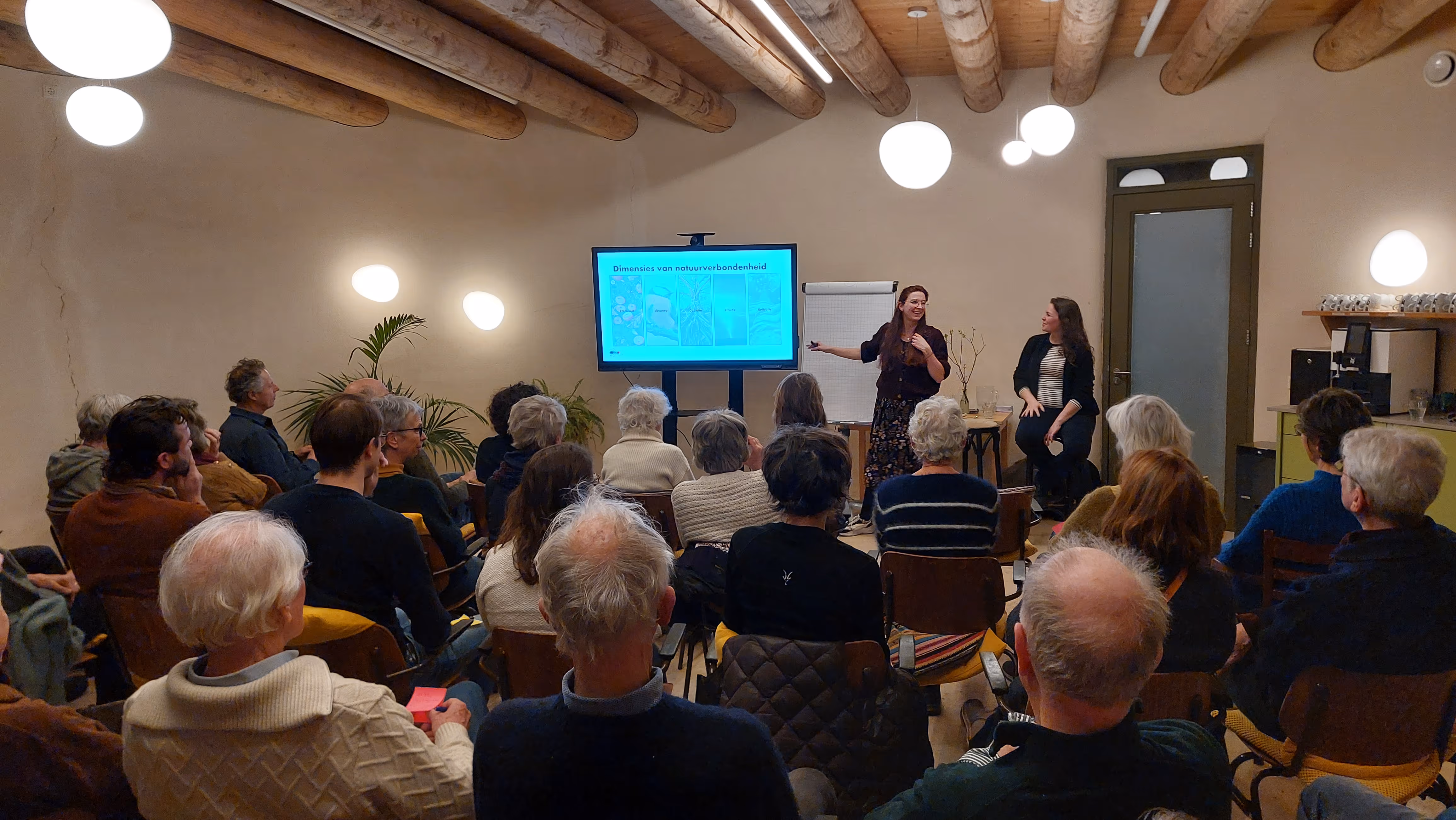 Ruim 45 mensen willen zich met liefde een winteravond onderdompelen in de wereld van mens-natuurrelaties. Tijdens de inloop brachten wetenschappers Bernadette van Heel en Helen Verploegen samen met de bezoekers een grafiek tot leven: in welke fase van ons leven voelen we ons het meest verbonden met de natuur?